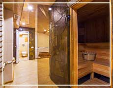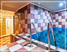 - Зал 1: Бассейн (купель) 2,5х2, холодный водопад, освежающий душ.